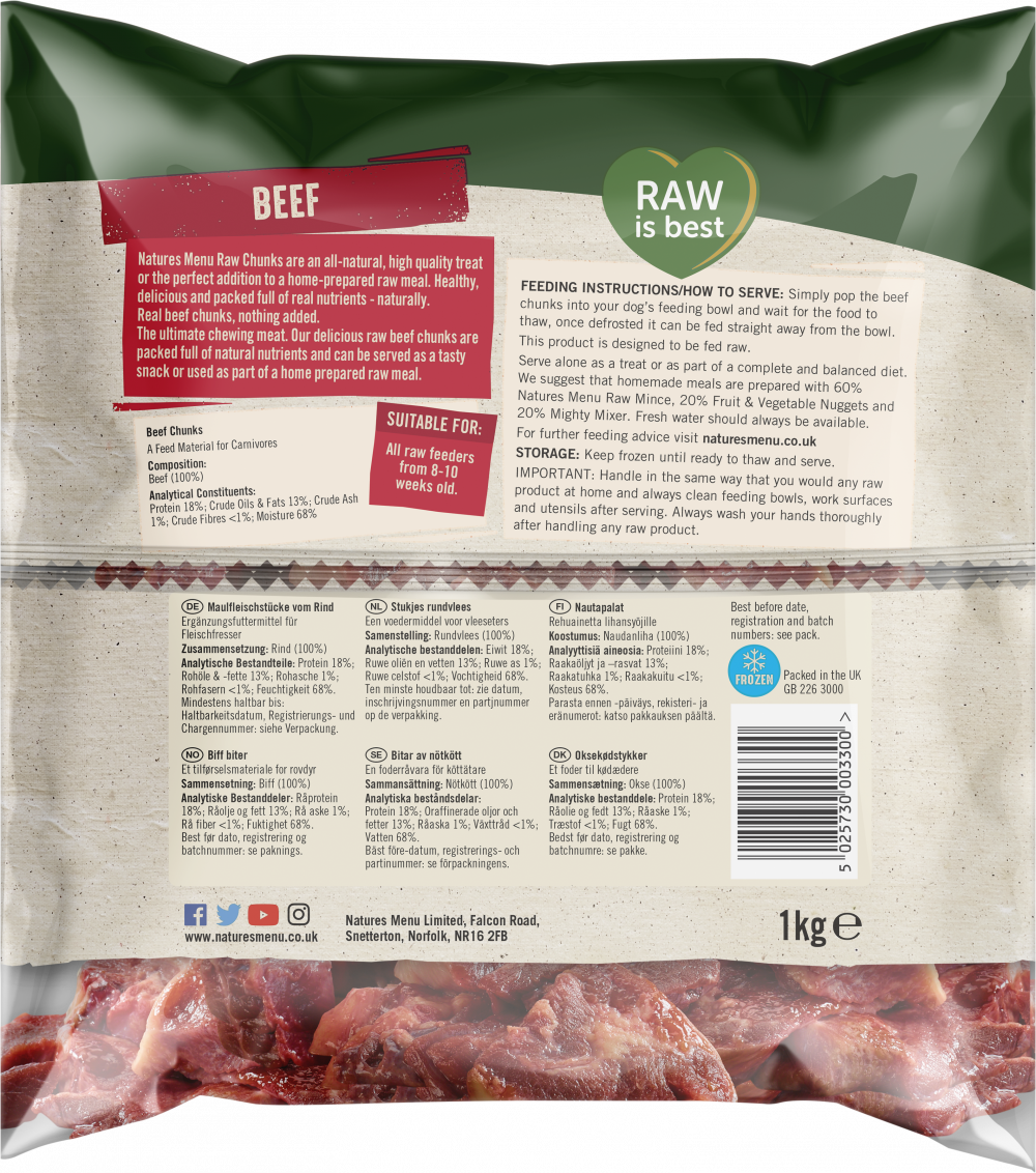 Our delicious raw Beef Chunks are packed full of natural nutrients and can be served as a tasty snack or as the meat component in homemade raw meals.