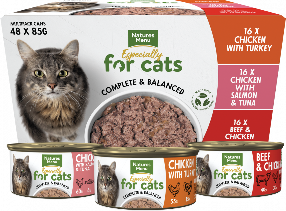 Our 48 can multipack cat food means you can mix things up a bit. The pack includes chicken with turkey, beef and chicken and chicken with salmon and tuna. Each packed with high quality, simple, natural ingredients.