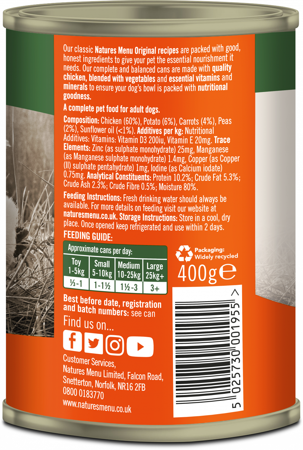 A nourishing meal of tender chicken, potato, carrots and peas. Complete and nutritionally balanced, natural goodness for adult dogs and puppies over 20 weeks of age.
