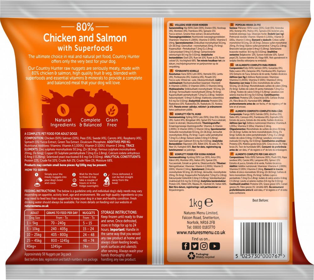 A meaty complete and balanced meal. Tender chicken and nutritious salmon blended with a delicious blend of superfoods.