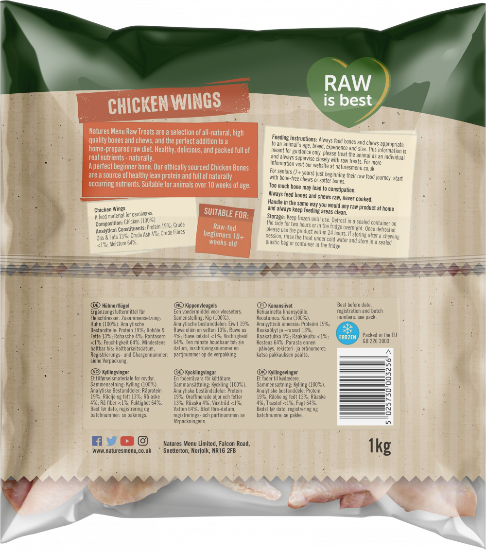 Soft and chewy, chicken wings make a perfect beginner bone. Our responsibly sourced Chicken Wings are a source of healthy lean protein with a light crunch. Suitable for dogs fed a raw diet over 10 weeks of age. Pack Size 1kg.