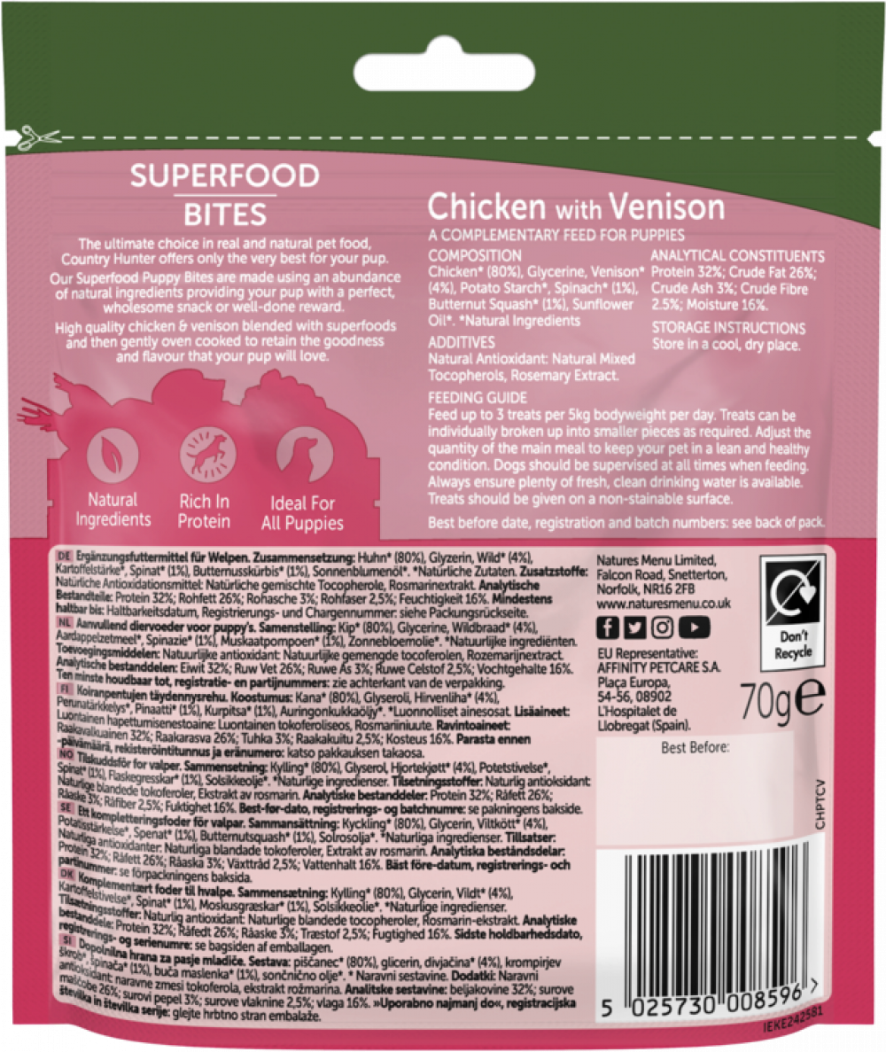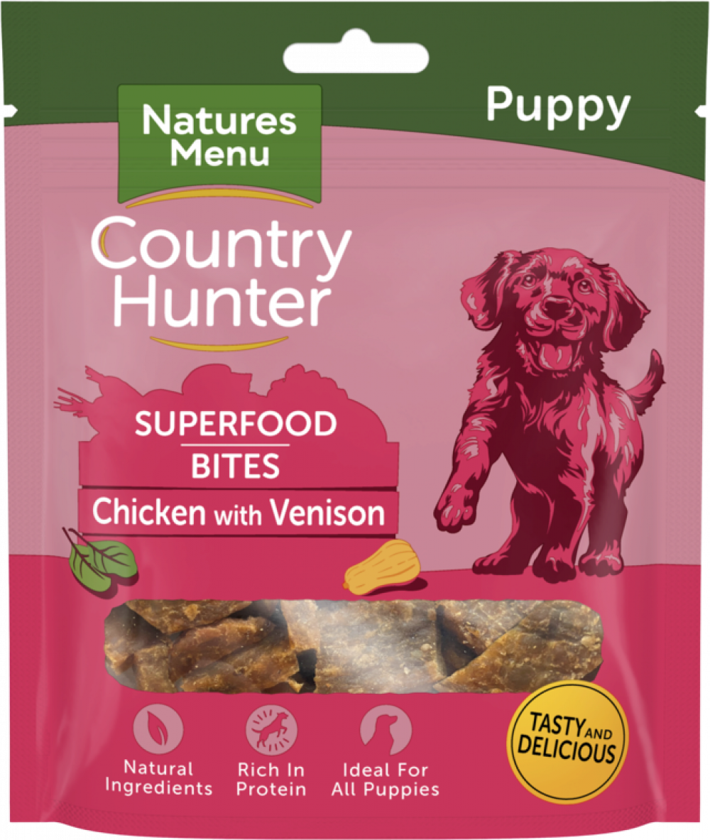 Delicious, chewy textured, oven cooked puppy bites made with 84% chicken with venison and enriched with added superfood ingredients.