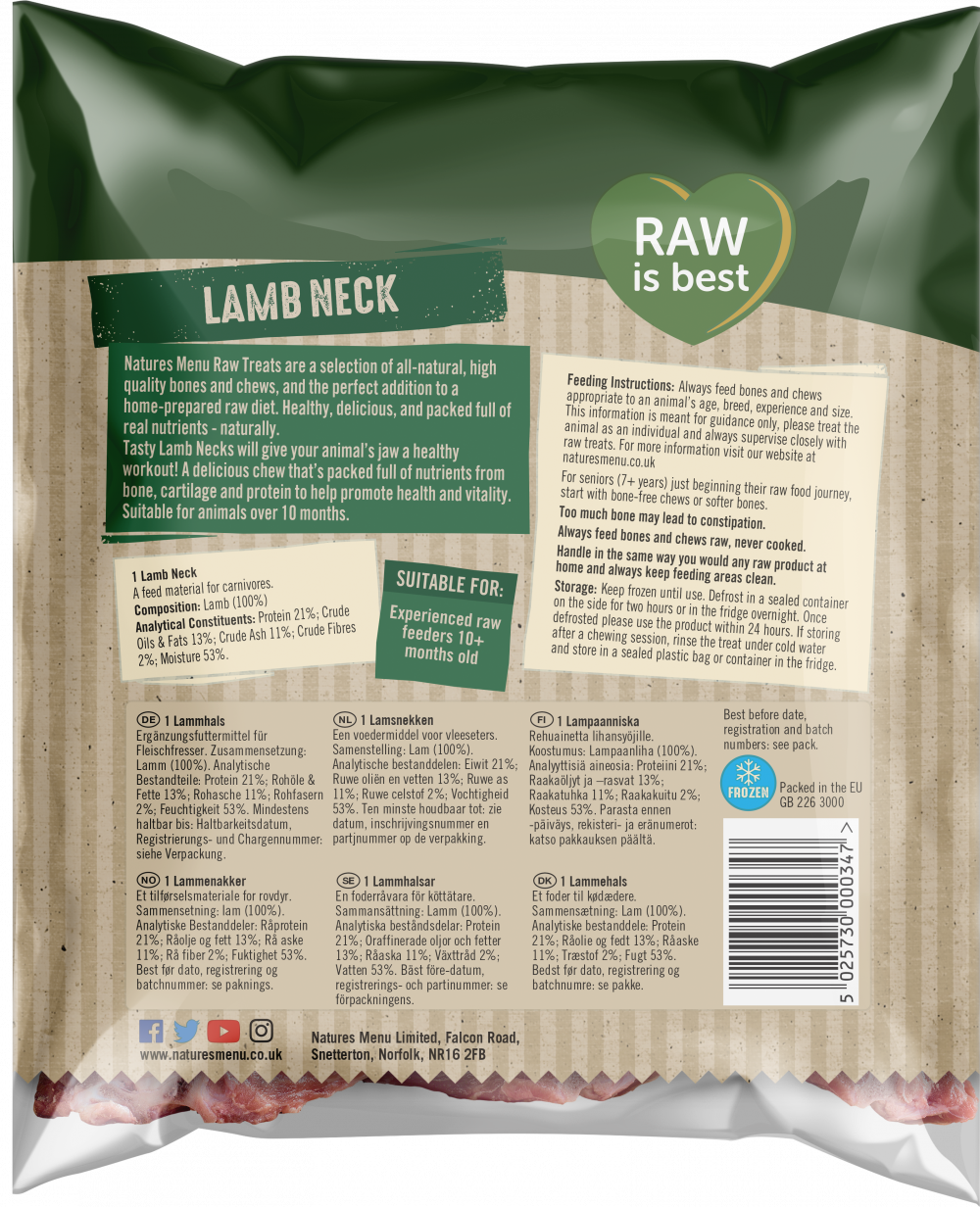Tasty Lamb Necks are tough and mighty, and great for those who like a big chew. A delicious treat that’s packed full of nutrients. Suitable for experienced raw-feeders 10+ months old. Pack size 1 x Raw Lamb Neck.