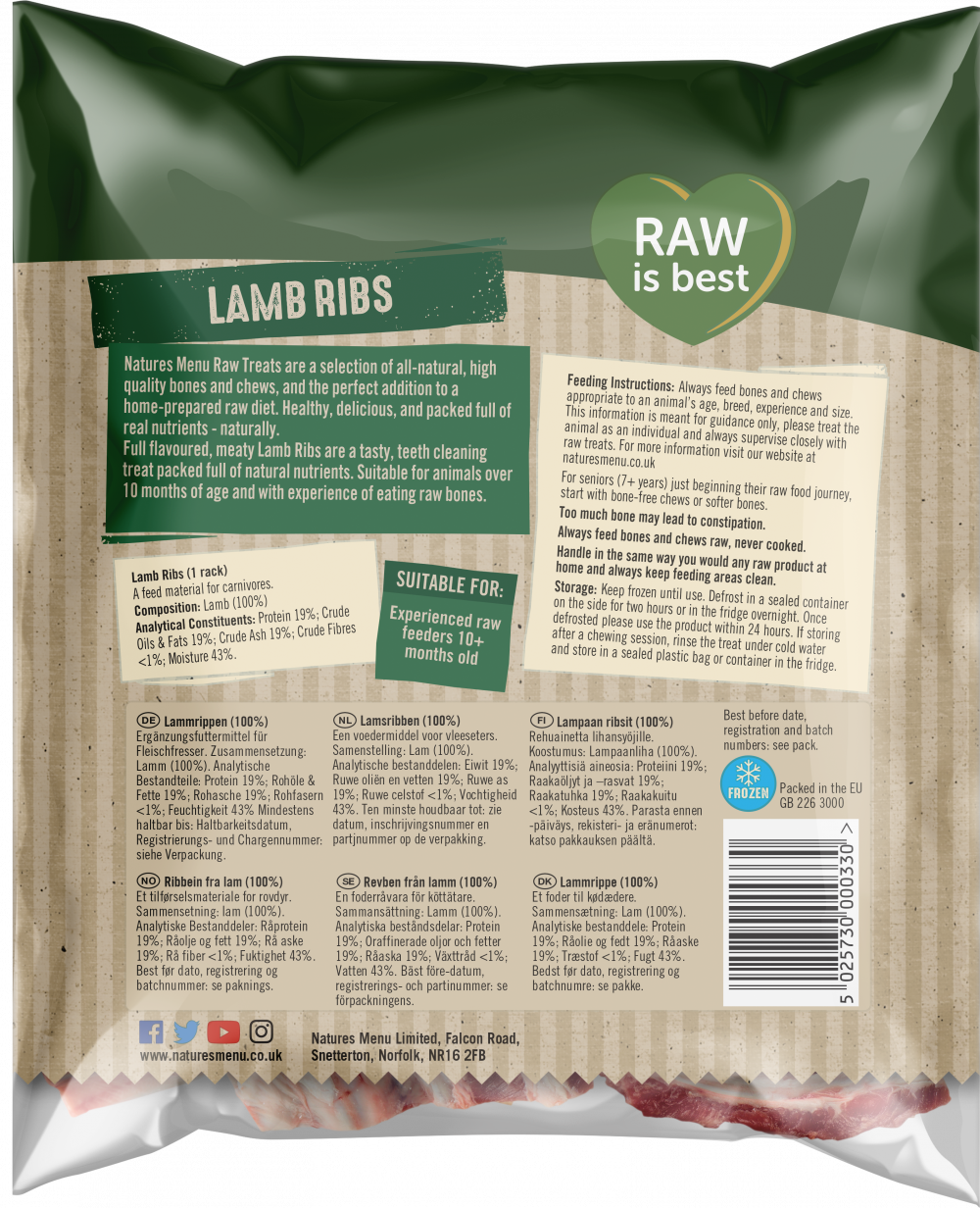 Full-flavoured, tough and mighty Lamb Ribs are a tasty treat that’s packed full of natural nutrients. Great for those who like a big chew. Suitable for animals over 10 months of age with experience of eating raw bones. Pack size 1 x Rack of Lamb Ribs.