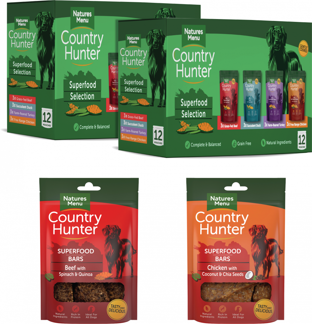 Our Country Hunter pouches and treats small sized bundle provides your dog with a scrumptious selection of 80% meat, complete and balanced meals blended with superfoods. Each bundle also contains two of our favourite Superfood Bars which are the perfect healthy snack.