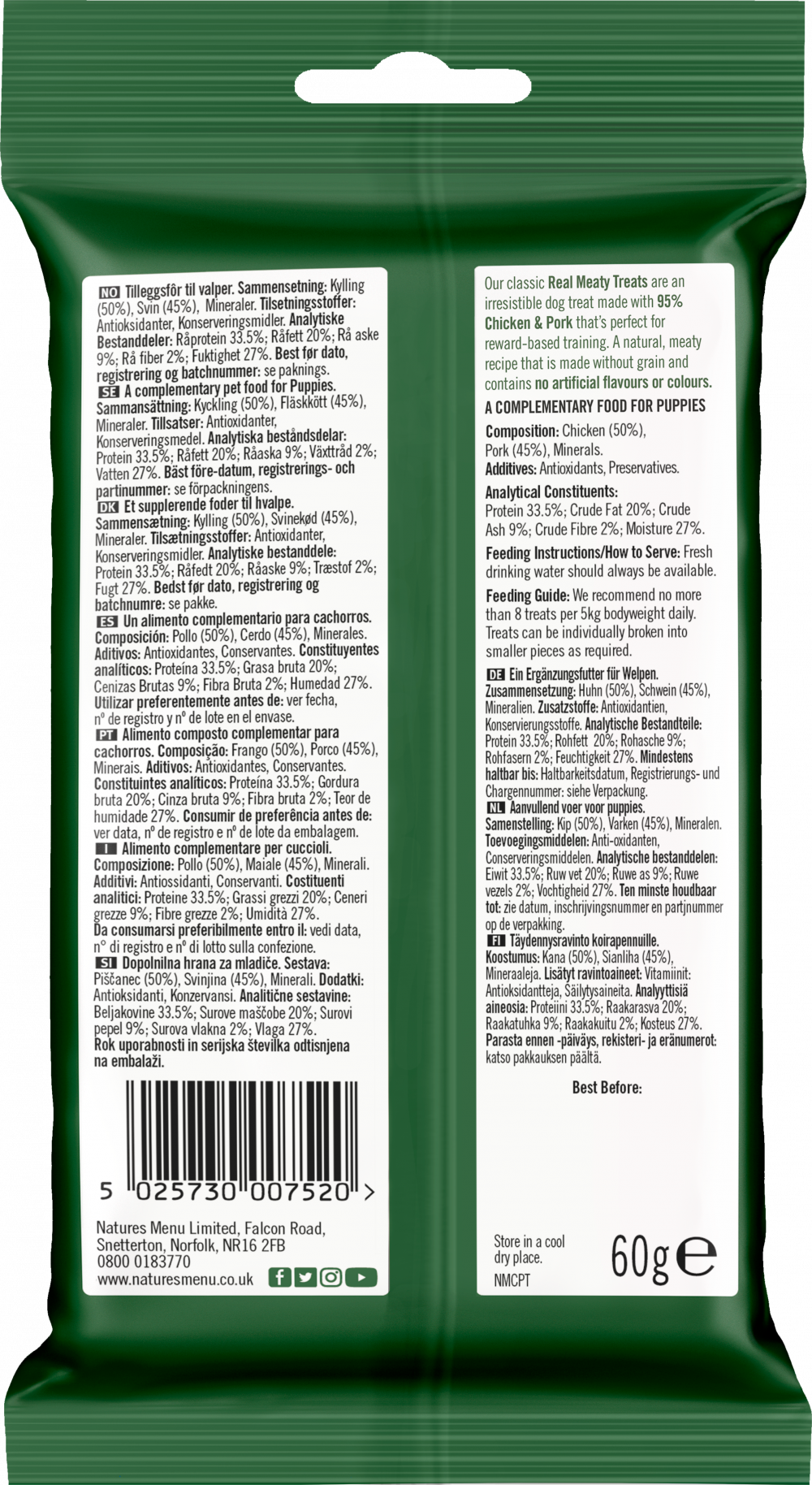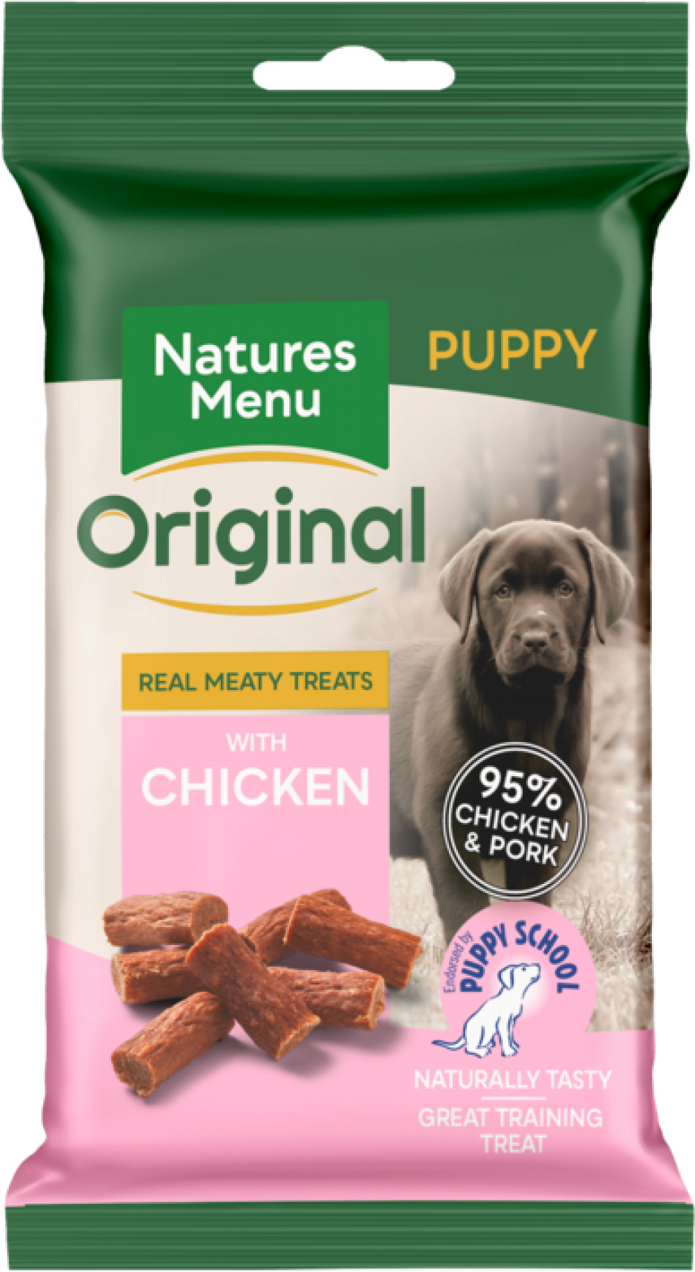 The ultimate real meaty training treat. Made with 95% real chicken and pork. An irresistible reward for puppies. Made without grain. Pack size 60g.