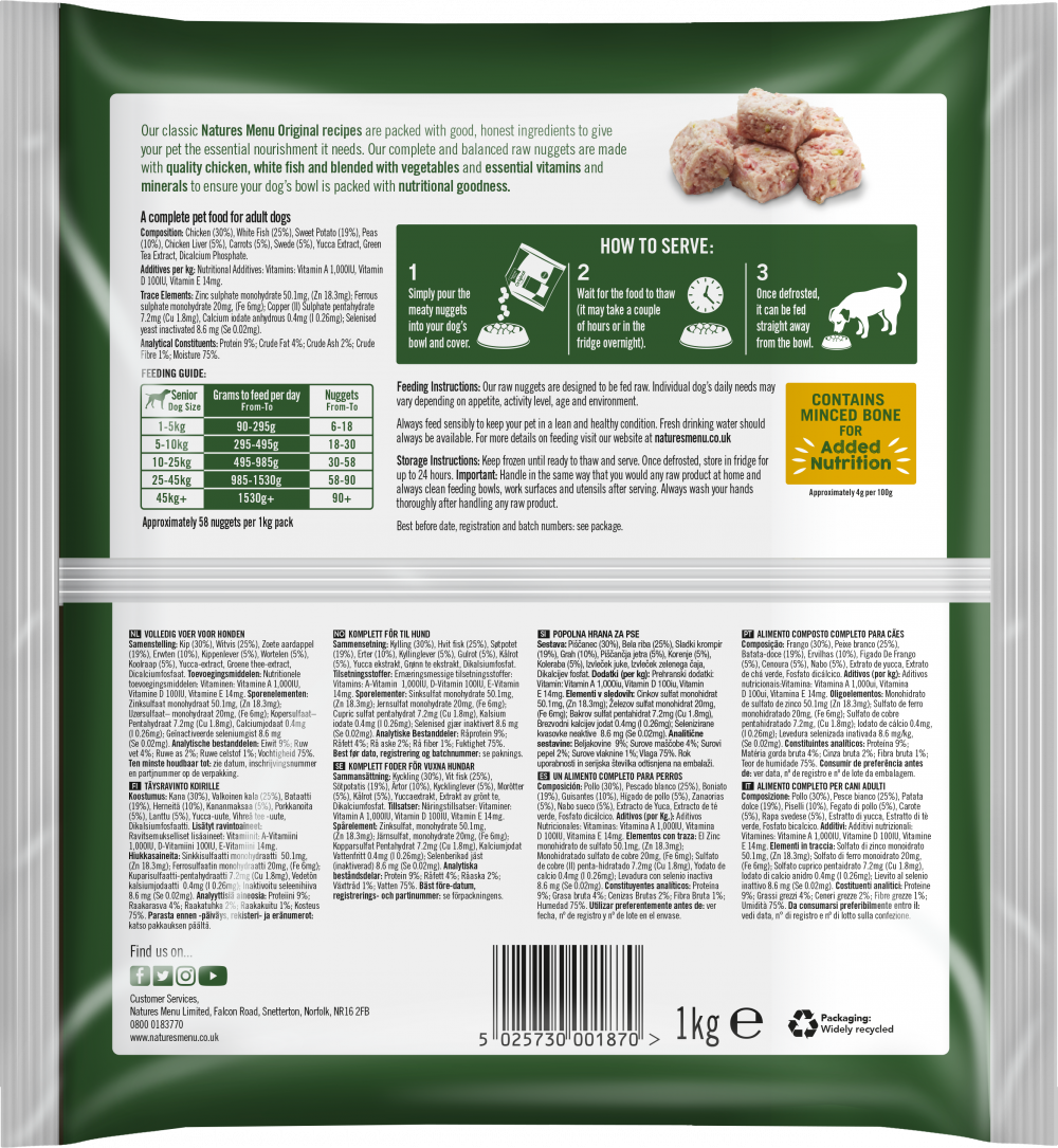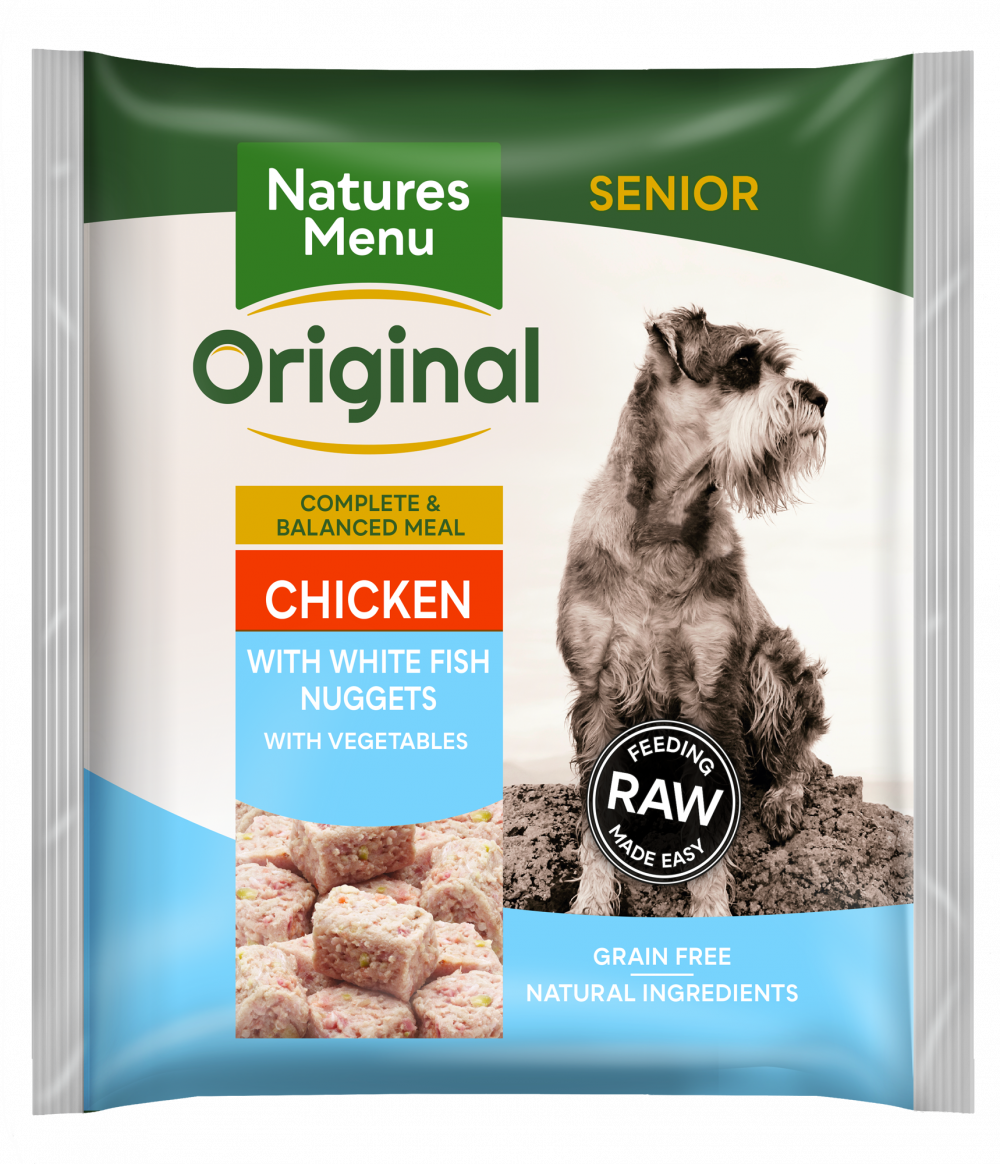 Our meaty nuggets for Senior Dogs are made with free range chicken and tasty white fish. Complete and balanced. Low fat and grain free.
