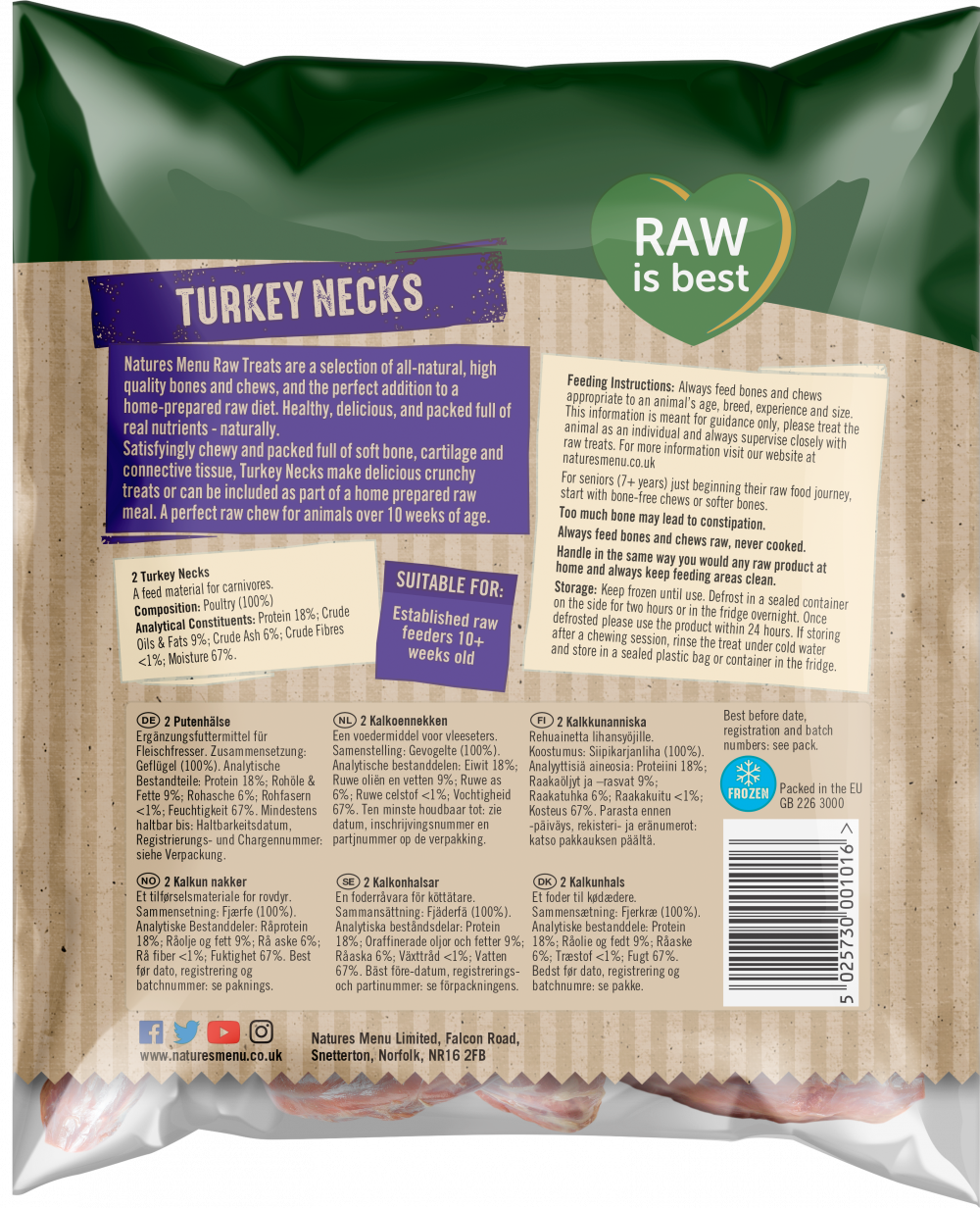 Satisfyingly chewy, firm and succulent, Turkey Necks make delicious crunchy treats or can be included as part of a home prepared raw meal. Suitable for dogs established on a raw diet over 10 weeks of age. Pack size 2 x Turkey Necks.